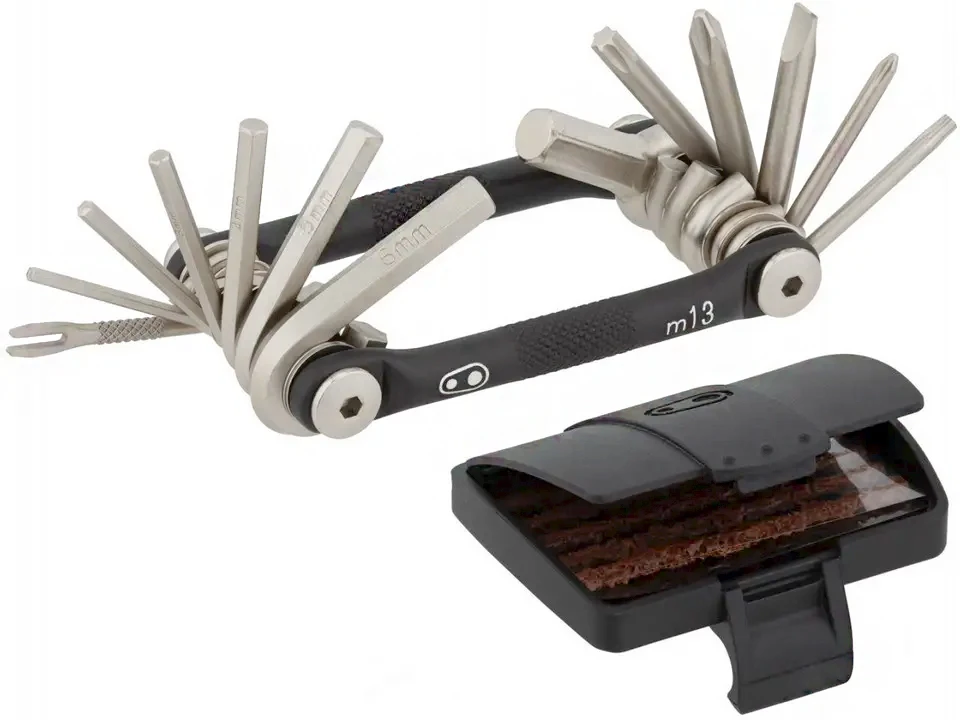 Мультитул Crankbrothers M13 содержит 13 инструментов, необходимых для базового ремонта велосипеда. На корпусе размещен съемный бокс с набором жгутов для ремонта бескамерных покрышек.