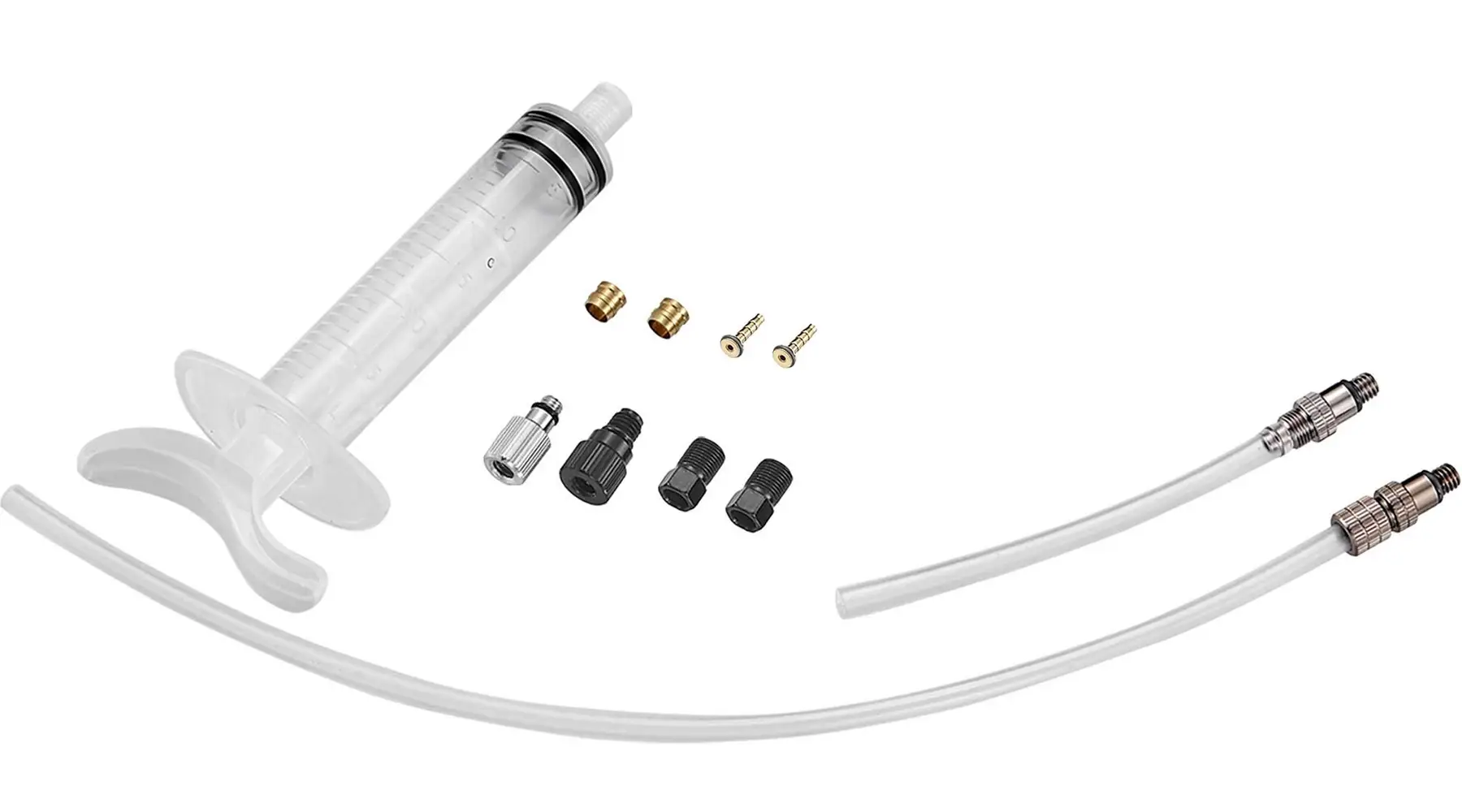 В комплект входят шприц, пластиковая трубка, фиксатор шланга, компрессионные втулки, латунные вставки с уплотнительным кольцом, впускной и выпускной клапаны (для рычага). Запасные штуцеры и оливки для Ø5,0 мм.