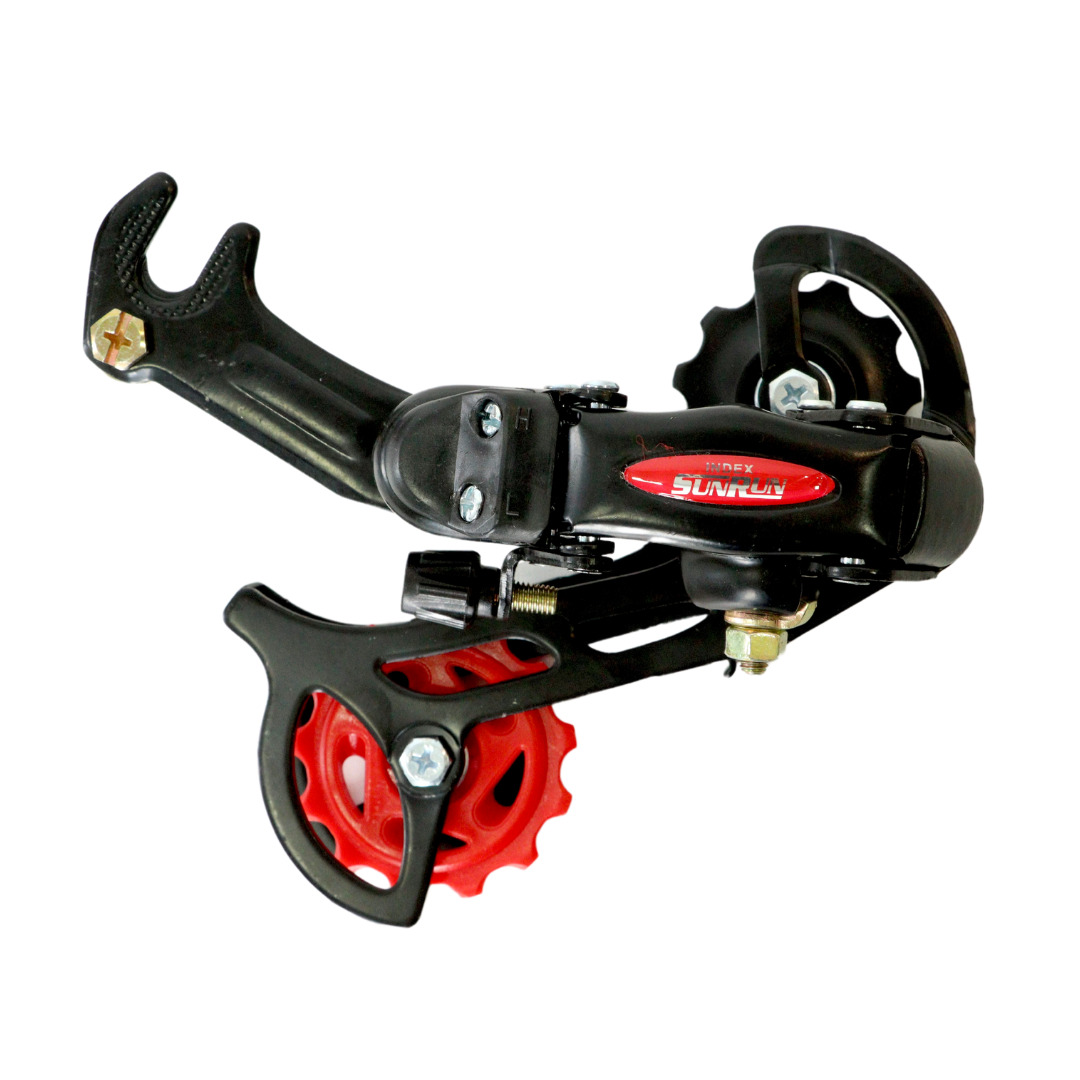 Переключатель задний SUNRUN RD‑HG‑40, 7 скоростей, под крюк, чёрный с красными роликами — надёжный экономичный механизм для восстановления или модернизации трансмиссии 7‑скоростных велосипедов.