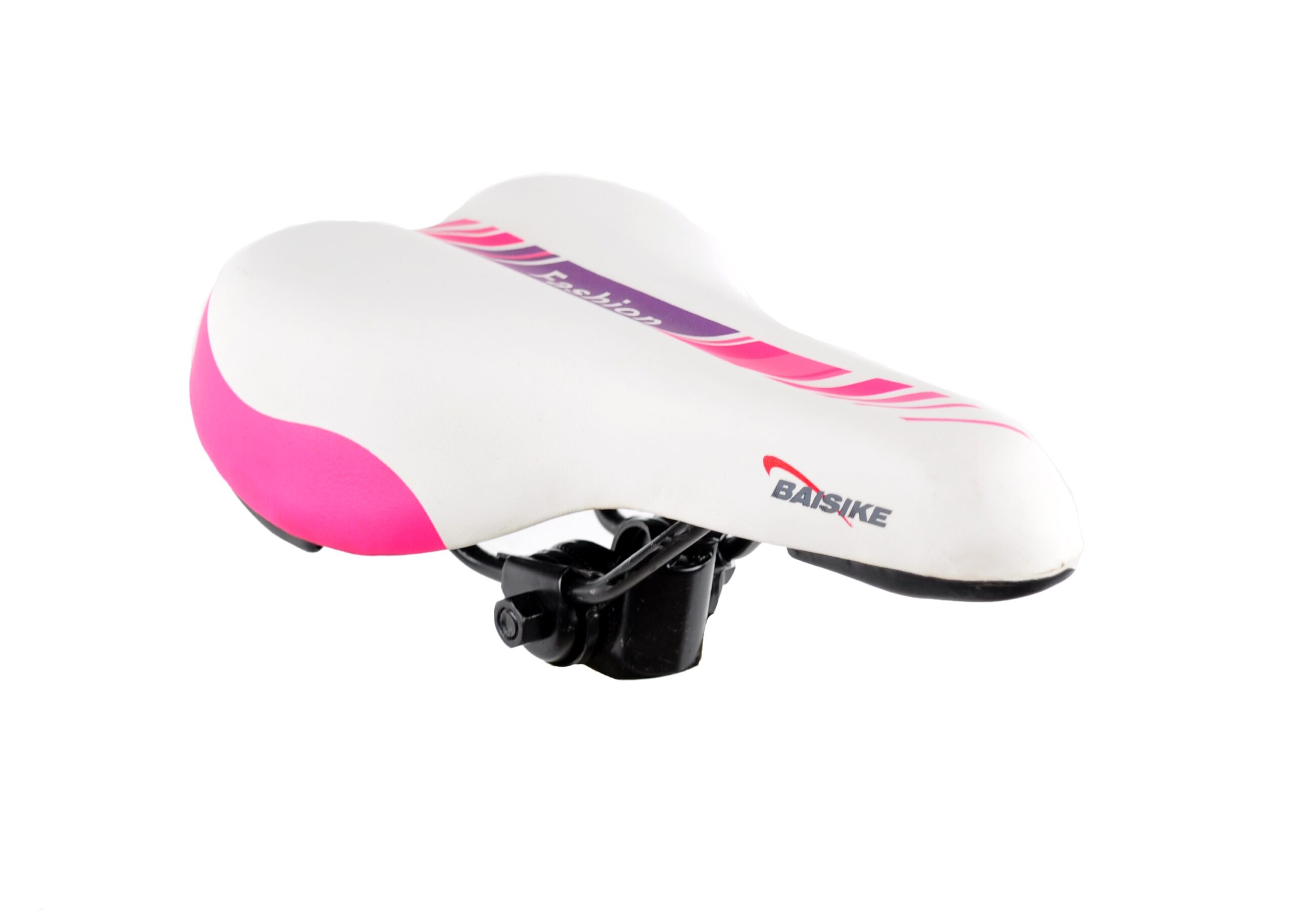 Седло BSK-N545-B с интегрированным замком-зажимом для фиксации положения на подседельном штыре. Верхняя часть выполнена из износостойкого синтетического материала, комбинирующего белые и розовые вставки, с декоративным принтом “Baisike”. Эргономичная форма и плотный слой пенного наполнителя обеспечивают комфорт при длительных поездках.