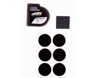 Набор для заклеивания камеры в пластмассовой В-образной упаковке включает 6 самоклеящихся заплат диаметром 20 мм и наждачную бумагу для затирки камеры.